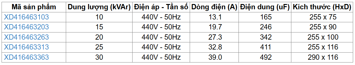 Thông số kỹ thuật Tụ bù Ducati 3 pha – Tụ khô 440V: