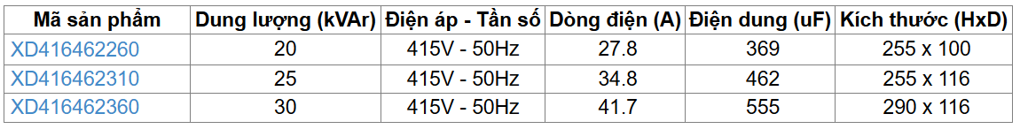 Thông số kỹ thuật Tụ bù Ducati 3 pha – Tụ khô 415V: