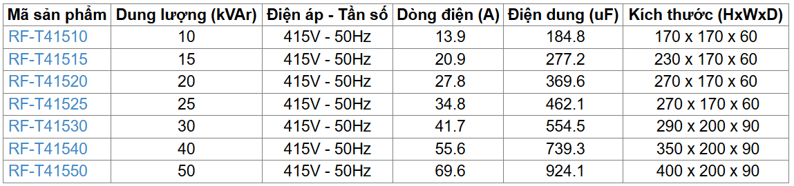 Thông số kỹ thuật Tụ bù Shizuki 3 pha – Tụ dầu 415V: